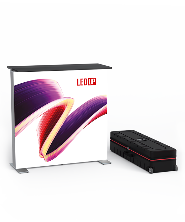 LEDUP Counter ist ein mobiles Thekensystem mit doppelt hinterleuchteten Bildflächen. Hochwertige Aluminiumkomponenten in Kombination mit perfekter LED-Technik garantieren eine absolut gleichmäßige Ausleuchtung und Helligkeit ohne Schattenbildung. Dank des robusten ABS-Transportkoffers ist er zudem sehr leicht zu transportieren.