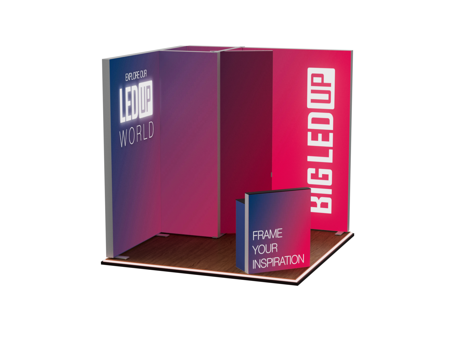 Dieses Set ist mit einer Grundfläche von 3x3 m und einer Höhe von 248 cm, sowie einem Counter MAX und einer Koje, eine kompakte Lösung für eine wirkungsvolle Präsentation.