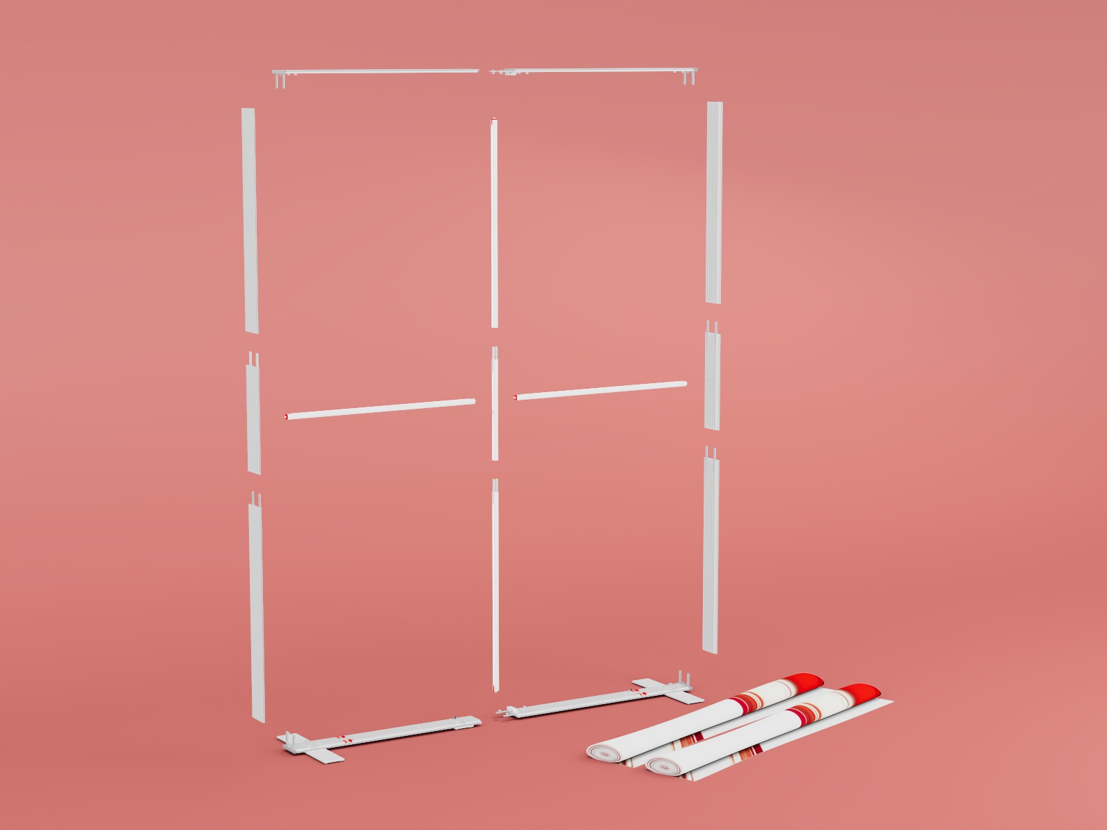 Simply remove the individual components from the handy ABS travel case, assemble them (no tools needed), screw on the feet – and you’re ready to go! Digital prints with sewn silicone welts around the edges can be easily attached to the system, are user-friendly in handling and can be changed independently any time.