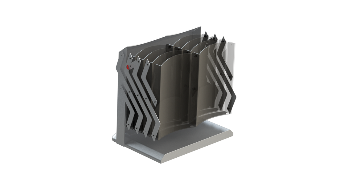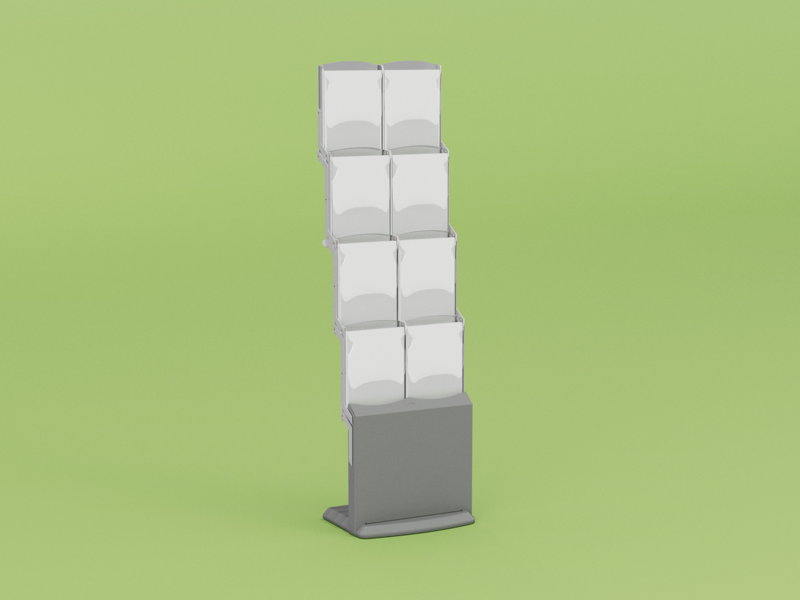 The brochure EASY UP BIG is a foldable brochure rack for eight brochures A4 size. The side parts and the frontplate are made of aluminium. The base is made of wood painted silver.