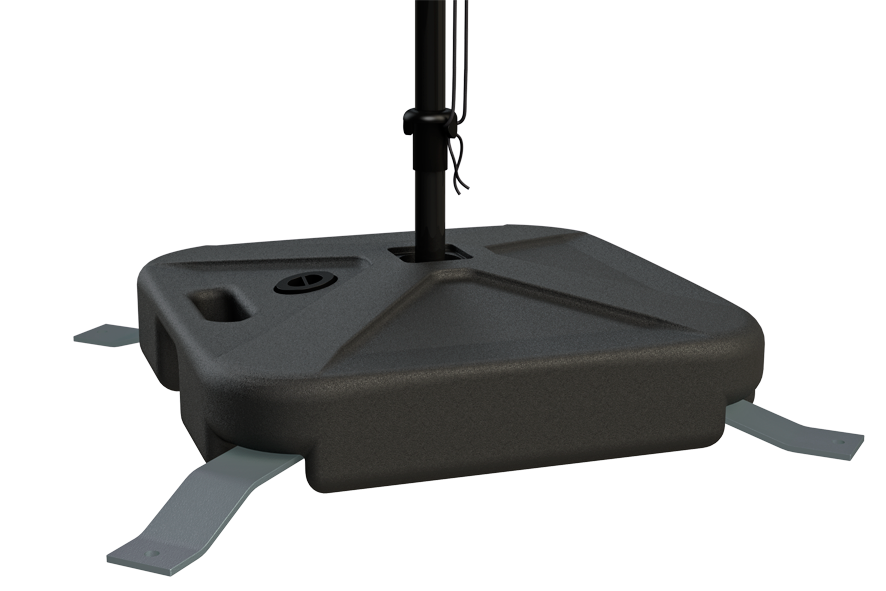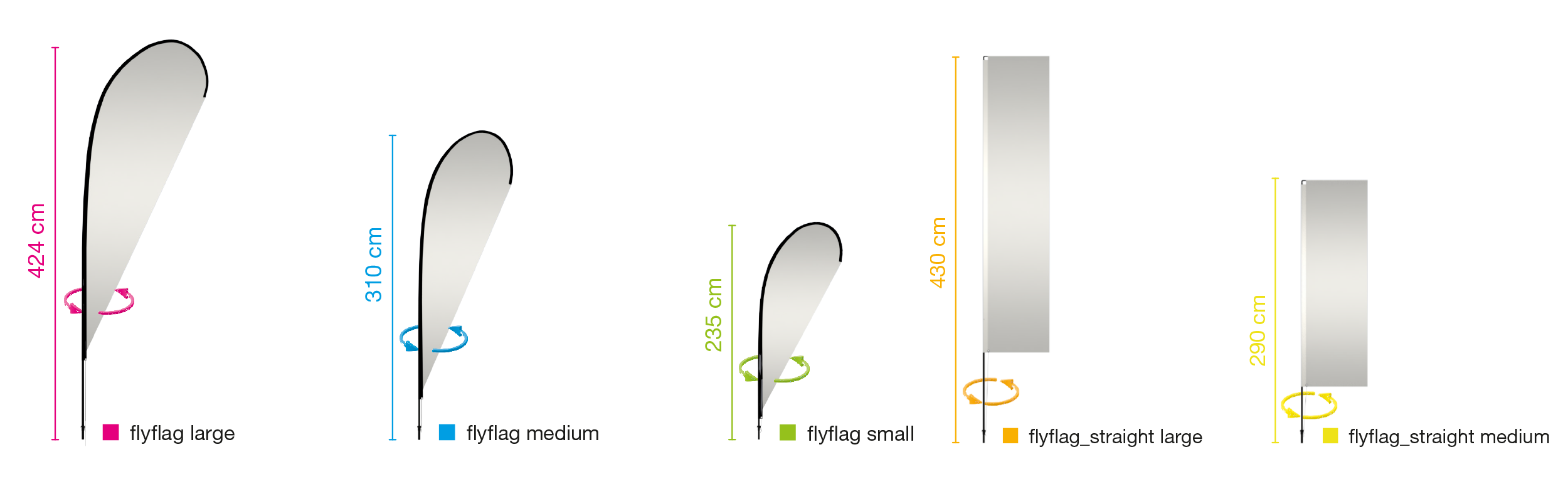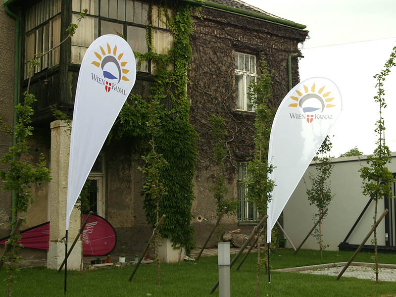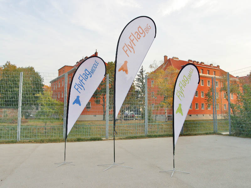 The moblie flag system flyflag comes in 2 different shapes – straight or drop shaped. 4 different base options are available - base, square metal base, soil insert and for some types a wall mounting bracket. Different heights from 235 cm to 430 cm are available. The system flyflag is delivered in a transport bag, singly packed in a cardboard box. All system parts are available as spare parts.